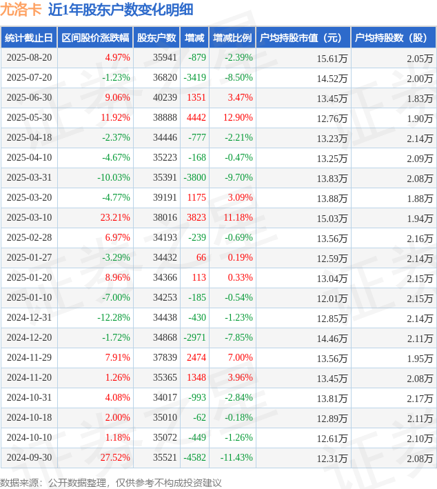 从股价来看,2025年7月20日至2025年8月20日,尤洛卡区间涨幅为4.97%,在此期间股东户数减少879.0户,减幅为2.39%。