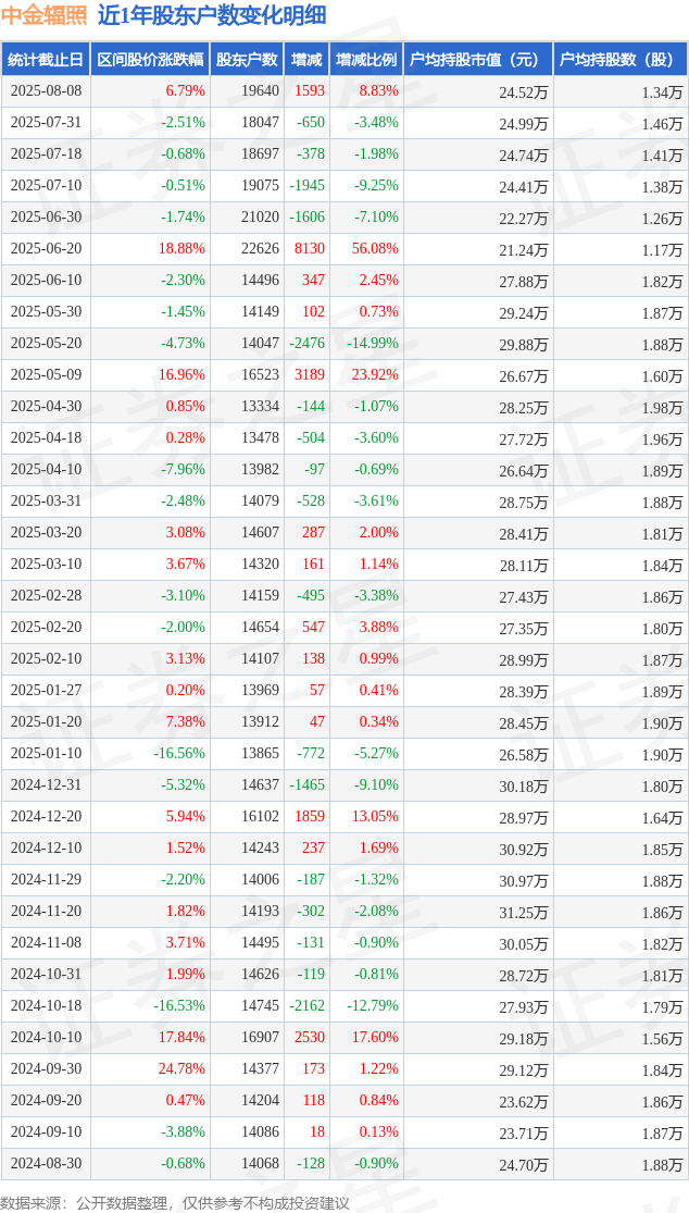证券之星消息,近日中金辐照披露,截至2025年8月8日公司股东户数为1.96万户,较7月31日增加1593.0户,增幅为8.83%。户均持股数量由上期的1.46万股减少至1.34万股,户均持股市值为24.52万元。