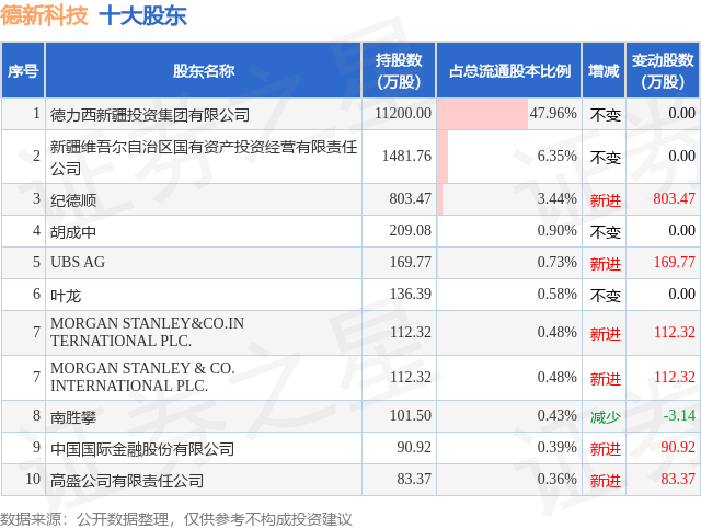 证券之星消息,8月26日德新科技发布公告《德新科技:德力西新能源科技股份有限公司关于持股5%以上股东权益变动触及1%刻度暨减持股份结果公告》,其股东新疆维吾尔自治区国有资产投资经营有限责任公司于2025年8月25日合计减持233.51万股,占公司目前总股本的1.0%,变动期间该股股价上涨6.74%,截止8月25日收盘报19.65元。
