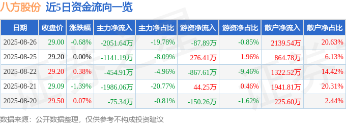 证券之星消息,截至2025年8月26日收盘,八方股份(603489)报收于29.0元,下跌0.68%,换手率1.52%,成交量3.56万手,成交额1.04亿元。