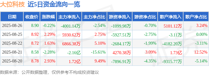 证券之星消息,截至2025年8月26日收盘,大位科技(600589)报收于8.9元,下跌0.22%,换手率11.91%,成交量176.09万手,成交额15.77亿元。