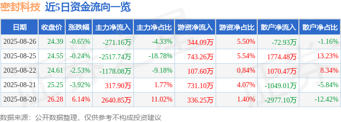 证券之星消息,截至2025年8月26日收盘,密封科技(301020)报收于24.39元,下跌0.65%,换手率1.75%,成交量2.57万手,成交额6260.68万元。
