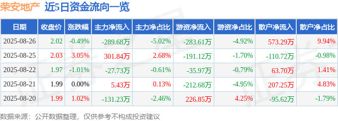 证券之星消息,截至2025年8月26日收盘,荣安地产(000517)报收于2.02元,下跌0.49%,换手率1.15%,成交量28.57万手,成交额5767.96万元。