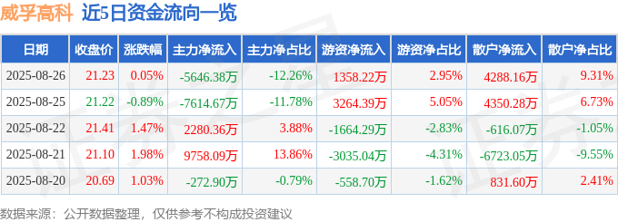 8月26日的资金流向数据方面,主力资金净流出5646.38万元,占总成交额12.26%,游资资金净流入1358.22万元,占总成交额2.95%,散户资金净流入4288.16万元,占总成交额9.31%。