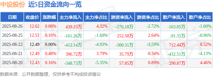 证券之星消息,截至2025年8月26日收盘,中设股份(002883)报收于12.62元,上涨0.88%,换手率6.14%,成交量8.07万手,成交额1.02亿元。