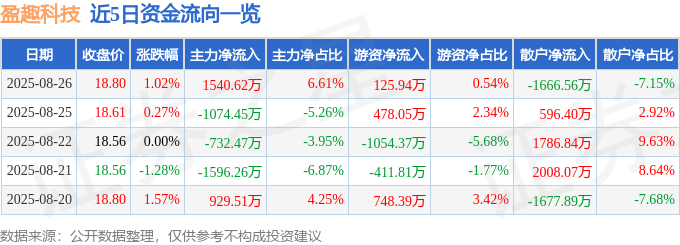 证券之星消息,截至2025年8月26日收盘,盈趣科技(002925)报收于18.8元,上涨1.02%,换手率1.69%,成交量12.43万手,成交额2.33亿元。