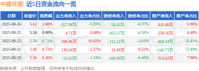 证券之星消息,截至2025年8月26日收盘,中建环能(300425)报收于5.62元,上涨1.08%,换手率1.58%,成交量10.75万手,成交额6032.66万元。