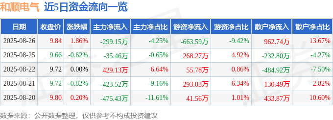 证券之星消息,截至2025年8月26日收盘,和顺电气(300141)报收于9.84元,上涨1.86%,换手率2.85%,成交量7.19万手,成交额7044.94万元。