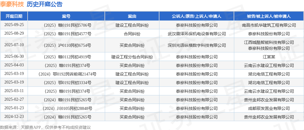 根据统计,近一年内以泰豪科技股份有限公司为当事人的历史开庭公告有11则,其中案由为“买卖合同纠纷”的公告以6则居首,其次为“建设工程合同纠纷”有3则,“合同纠纷”有1则。历史开庭公告如下: