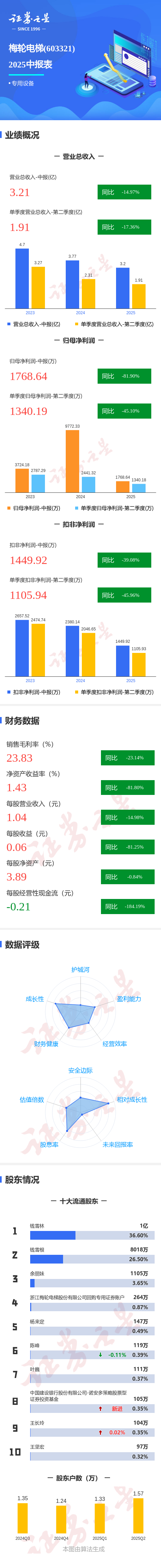 证券之星消息,梅轮电梯2025年中报显示,公司主营收入3.21亿元,同比下降14.98%;归母净利润1768.64万元,同比下降81.9%;扣非净利润1449.92万元,同比下降39.08%;其中2025年第二季度,公司单季度主营收入1.91亿元,同比下降17.37%;单季度归母净利润1340.19万元,同比下降45.1%;单季度扣非净利润1105.94万元,同比下降45.96%;负债率34.19%,投资收益60.51万元,财务费用-866.35万元,毛利率23.83%。