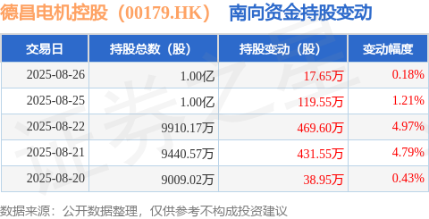 证券之星消息,8月26日南向资金增持17.65万股德昌电机控股(00179.HK)。近5个交易日中,获南向资金增持的有5天,累计净增持1077.3万股。近20个交易日中,获南向资金增持的有12天,累计净增持1032.46万股。截至目前,南向资金持有德昌电机控股(00179.HK)1.0亿股,占公司已发行普通股的10.74%。