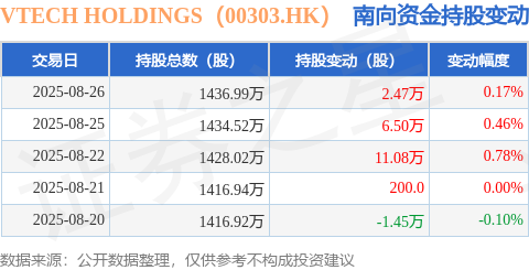 证券之星消息,8月26日南向资金增持2.47万股VTECH HOLDINGS(00303.HK)。近5个交易日中,获南向资金增持的有4天,累计净增持18.62万股。近20个交易日中,获南向资金增持的有19天,累计净增持393.79万股。截至目前,南向资金持有VTECH HOLDINGS(00303.HK)1436.99万股,占公司已发行普通股的5.67%。