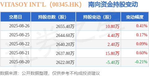 证券之星消息,8月26日南向资金增持10.8万股VITASOY INT'L(00345.HK)。近5个交易日中,获南向资金增持的有4天,累计净增持28.0万股。近20个交易日中,获南向资金增持的有13天,累计净增持197.0万股。截至目前,南向资金持有VITASOY INT'L(00345.HK)2655.4万股,占公司已发行普通股的2.5%。