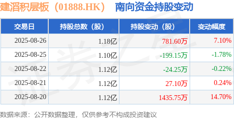 证券之星消息,8月26日南向资金增持781.6万股建滔积层板(01888.HK)。近5个交易日中,获南向资金增持的有3天,累计净增持2021.05万股。近20个交易日中,获南向资金增持的有12天,累计净增持3843.7万股。截至目前,南向资金持有建滔积层板(01888.HK)1.18亿股,占公司已发行普通股的3.77%。