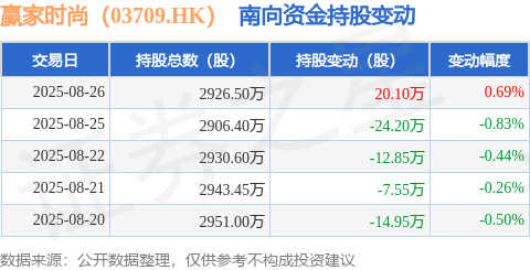 证券之星消息,8月26日南向资金增持20.1万股赢家时尚(03709.HK)。近5个交易日中,获南向资金减持的有4天,累计净减持39.45万股。近20个交易日中,获南向资金增持的有8天,累计净增持49.5万股。截至目前,南向资金持有赢家时尚(03709.HK)2926.5万股,占公司已发行普通股的4.15%。