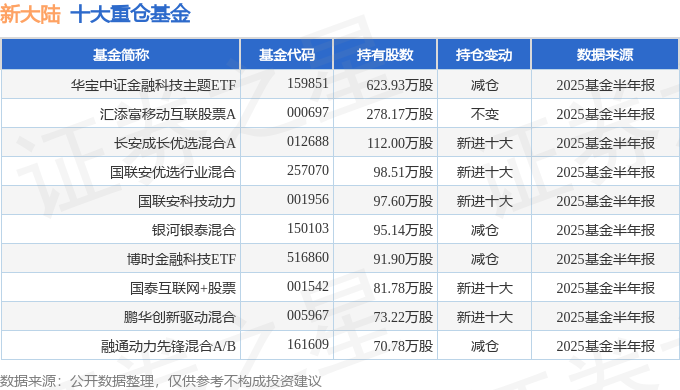 持有新大陆最多的基金为华宝中证金融科技主题ETF,目前规模为57.31亿元,最新净值1.0156(8月26日),较上一交易日下跌0.12%,近一年上涨180.69%。该基金现任基金经理为陈建华 曹旭辰。
