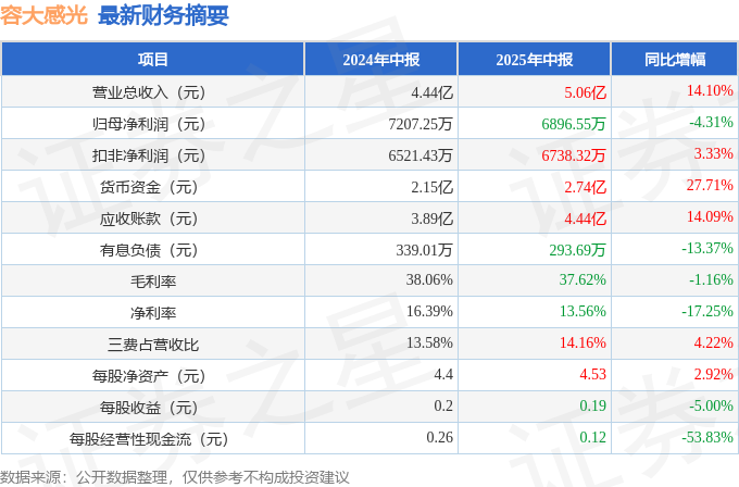 据证券之星公开数据整理,近期容大感光(300576)发布2025年中报。截至本报告期末,公司营业总收入5.06亿元,同比上升14.1%,归母净利润6896.55万元,同比下降4.31%。按单季度数据看,第二季度营业总收入2.64亿元,同比上升10.61%,第二季度归母净利润3435.09万元,同比下降4.13%。本报告期容大感光公司应收账款体量较大,当期应收账款占最新年报归母净利润比达363.06%。