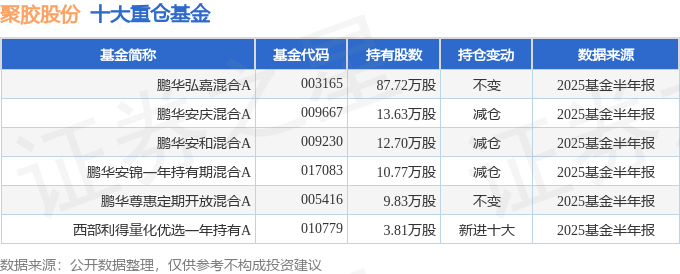 持有聚胶股份最多的基金为鹏华弘嘉混合A,目前规模为4.52亿元,最新净值2.9556(8月26日),较上一交易日下跌0.19%,近一年上涨82.54%。该基金现任基金经理为汤志彦。