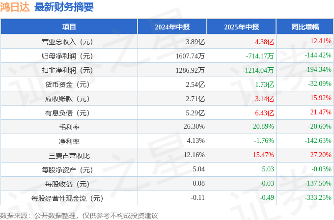 据证券之星公开数据整理,近期鸿日达(301285)发布2025年中报。根据财报显示,鸿日达增收不增利。截至本报告期末,公司营业总收入4.38亿元,同比上升12.41%,归母净利润-714.17万元,同比下降144.42%。按单季度数据看,第二季度营业总收入2.76亿元,同比上升15.45%,第二季度归母净利润502.92万元,同比下降56.94%。