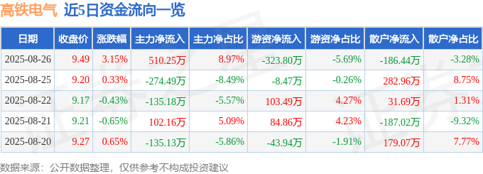 证券之星消息,截至2025年8月26日收盘,高铁电气(688285)报收于9.49元,上涨3.15%,换手率1.6%,成交量6.03万手,成交额5689.78万元。