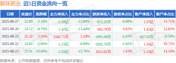 证券之星消息,截至2025年8月27日收盘,联环药业(600513)报收于22.89元,下跌5.1%,换手率14.79%,成交量42.23万手,成交额9.96亿元。