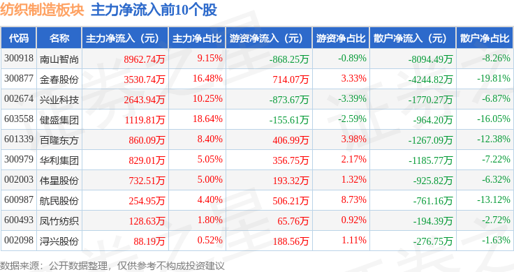 从资金流向上来看,当日纺织制造板块主力资金净流出4721.86万元,游资资金净流入5338.97万元,散户资金净流出617.11万元。纺织制造板块个股资金流向见下表: