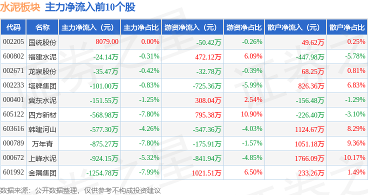 从资金流向上来看,当日水泥板块主力资金净流出6.13亿元,游资资金净流出9296.08万元,散户资金净流入7.06亿元。水泥板块个股资金流向见下表: