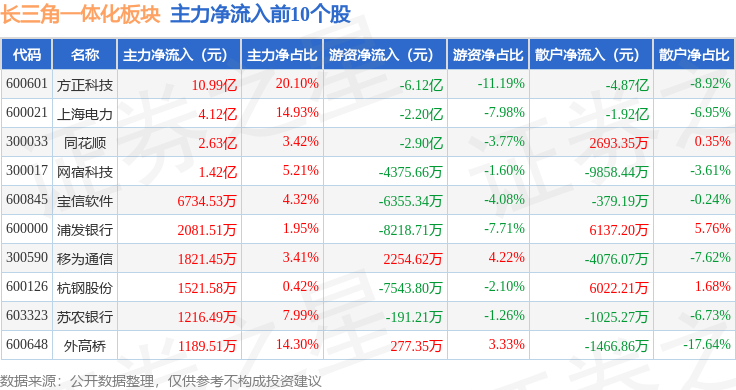 从资金流向上来看,当日长三角一体化板块主力资金净流出72.11亿元,游资资金净流入8.9亿元,散户资金净流入63.21亿元。长三角一体化板块个股资金流向见下表: