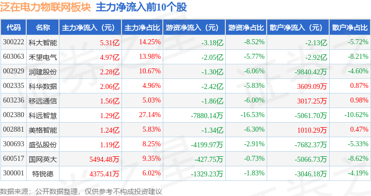 从资金流向上来看,当日泛在电力物联网板块主力资金净流出41.58亿元,游资资金净流入1.02亿元,散户资金净流入40.55亿元。泛在电力物联网板块个股资金流向见下表: