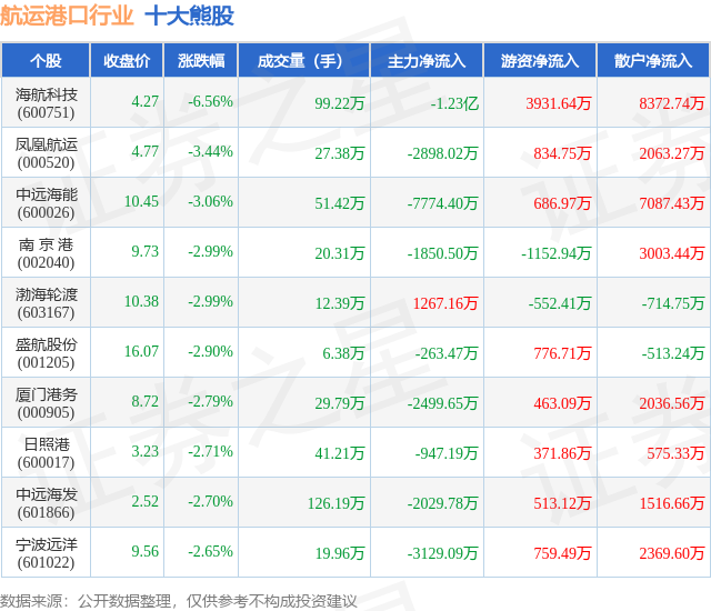 个股表现方面,航运港口行业当日领跌股为海航科技(600751),该股当日报收4.27,下跌6.56%,成交量99.22万,主力资金净流出1.23亿元。凤凰航运(000520)以下跌3.44%紧随其后,该股当日成交量27.38万,主力资金净流出2898.02万元。除此之外,中远海能(600026)、南 京 港(002040)、渤海轮渡(603167)均进入当日熊股之列。具体个股列表见下表: