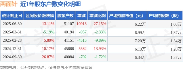 从股价来看,2025年3月31日至2025年6月30日,两面针区间涨幅为13.11%,在此期间股东户数增加1.09万户,增幅为27.15%。