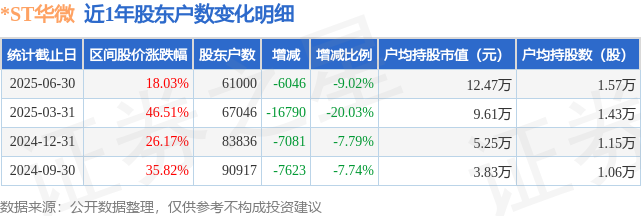 从股价来看,2025年3月31日至2025年6月30日,*ST华微区间涨幅为18.03%,在此期间股东户数减少6046.0户,减幅为9.02%。