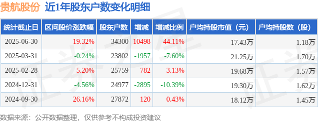证券之星消息,近日贵航股份披露,截至2025年6月30日公司股东户数为3.43万户,较3月31日增加1.05万户,增幅为44.11%。户均持股数量由上期的1.7万股减少至1.18万股,户均持股市值为17.43万元。