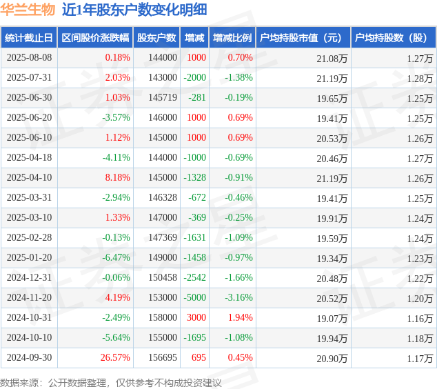 从股价来看,2025年7月31日至2025年8月8日,华兰生物区间涨幅为0.18%,在此期间股东户数增加1000.0户,增幅为0.7%。