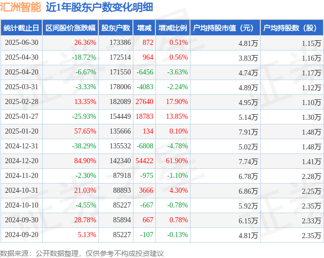 从股价来看,2025年4月30日至2025年6月30日,汇洲智能区间涨幅为26.36%,在此期间股东户数增加872.0户,增幅为0.51%。