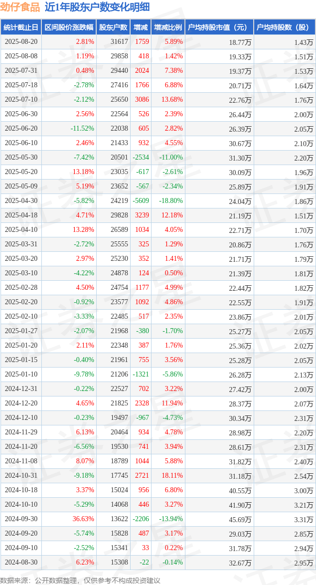 证券之星消息,近日劲仔食品披露,截至2025年8月20日公司股东户数为3.16万户,较8月8日增加1759.0户,增幅为5.89%。户均持股数量由上期的1.51万股减少至1.43万股,户均持股市值为18.77万元。
