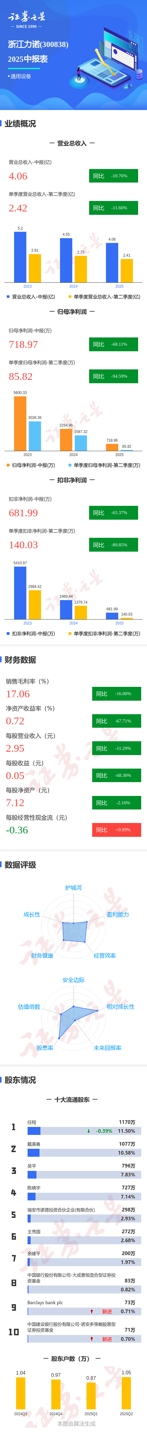证券之星消息,浙江力诺2025年中报显示,公司主营收入4.06亿元,同比下降10.77%;归母净利润718.97万元,同比下降68.12%;扣非净利润681.99万元,同比下降65.37%;其中2025年第二季度,公司单季度主营收入2.42亿元,同比下降11.67%;单季度归母净利润85.82万元,同比下降94.59%;单季度扣非净利润140.03万元,同比下降89.85%;负债率48.49%,投资收益-96.6万元,财务费用176.57万元,毛利率17.06%。