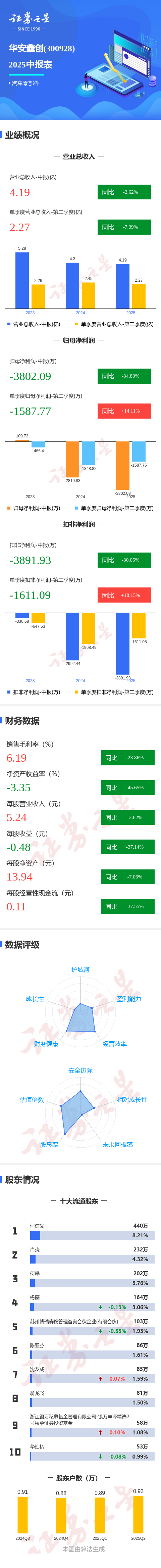 证券之星消息,华安鑫创2025年中报显示,公司主营收入4.19亿元,同比下降2.62%;归母净利润-3802.09万元,同比下降34.83%;扣非净利润-3891.93万元,同比下降30.06%;其中2025年第二季度,公司单季度主营收入2.27亿元,同比下降7.4%;单季度归母净利润-1587.77万元,同比上升14.12%;单季度扣非净利润-1611.09万元,同比上升18.16%;负债率14.1%,投资收益-932.42万元,财务费用62.37万元,毛利率6.19%。