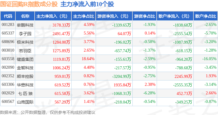 资金流向方面,国证回购R(480063)指数成份股当日主力资金净流出合计21.61亿元,游资资金净流入合计5.71亿元,散户资金净流入合计15.9亿元。成份股资金流向详情见下表: