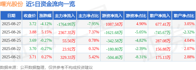 证券之星消息,截至2025年8月27日收盘,曙光股份(600303)报收于3.72元,下跌4.12%,换手率8.69%,成交量58.69万手,成交额2.22亿元。