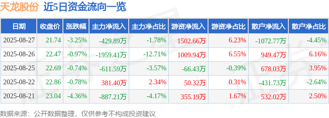 证券之星消息,截至2025年8月27日收盘,天龙股份(603266)报收于21.74元,下跌3.25%,换手率5.41%,成交量10.76万手,成交额2.41亿元。