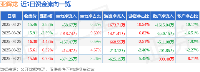 8月27日的资金流向数据方面,主力资金净流出58.67万元,占总成交额0.37%,游资资金净流入1673.71万元,占总成交额10.54%,散户资金净流出1615.04万元,占总成交额10.17%。