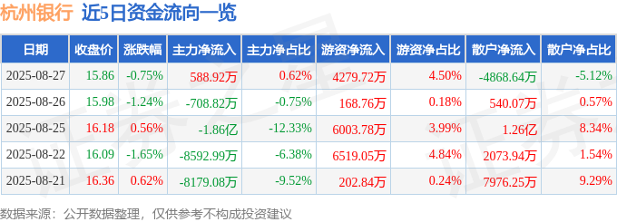 证券之星消息,截至2025年8月27日收盘,杭州银行(600926)报收于15.86元,下跌0.75%,换手率0.82%,成交量59.6万手,成交额9.51亿元。