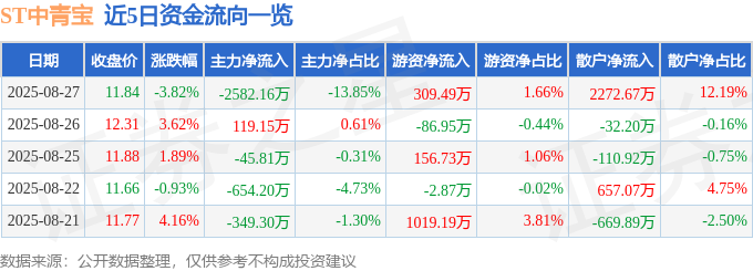 证券之星消息,截至2025年8月27日收盘,ST中青宝(300052)报收于11.84元,下跌3.82%,换手率5.9%,成交量15.46万手,成交额1.86亿元。