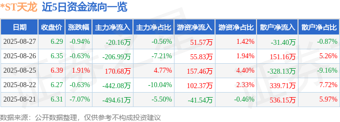 证券之星消息,截至2025年8月27日收盘,*ST天龙(300029)报收于6.29元,下跌0.94%,换手率2.8%,成交量5.62万手,成交额3625.19万元。