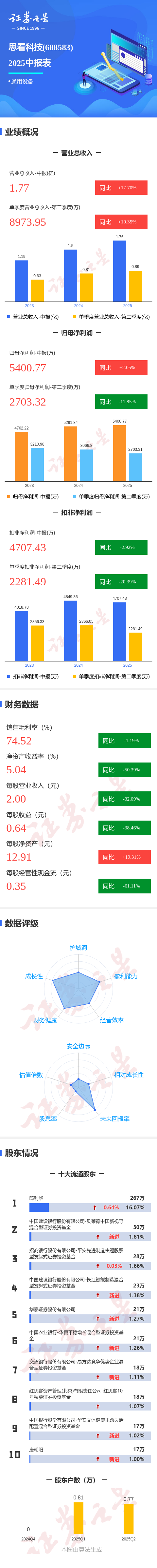 证券之星消息,思看科技2025年中报显示,公司主营收入1.77亿元,同比上升17.7%;归母净利润5400.77万元,同比上升2.06%;扣非净利润4707.43万元,同比下降2.93%;其中2025年第二季度,公司单季度主营收入8973.95万元,同比上升10.35%;单季度归母净利润2703.32万元,同比下降11.85%;单季度扣非净利润2281.49万元,同比下降20.4%;负债率9.91%,投资收益550.87万元,财务费用-511.88万元,毛利率74.52%。