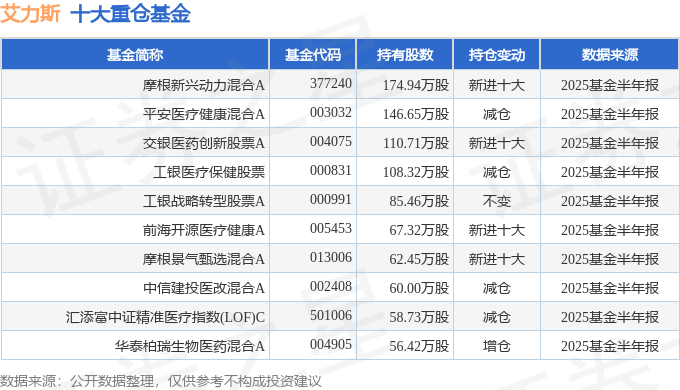 持有艾力斯最多的基金为摩根新兴动力混合A,目前规模为55.6亿元,最新净值7.3778(8月27日),较上一交易日上涨0.14%,近一年上涨76.96%。该基金现任基金经理为杜猛。