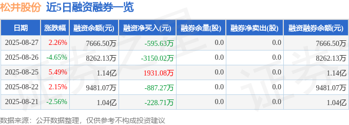 证券之星消息,截至2025年8月27日收盘,松井股份(688157)报收于44.43元,上涨2.26%,换手率2.23%,成交量3.48万手,成交额1.58亿元。