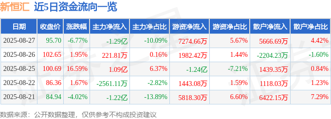 证券之星消息,截至2025年8月27日收盘,新恒汇(301678)报收于95.7元,下跌6.77%,换手率28.78%,成交量13.1万手,成交额12.82亿元。