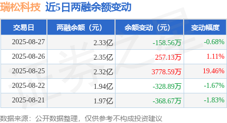 证券之星消息,8月27日,瑞松科技(688090)融资买入3841.94万元,融资偿还4000.49万元,融资净卖出158.56万元,融资余额2.33亿元,近20个交易日中有12个交易日出现融资净买入。